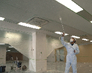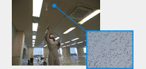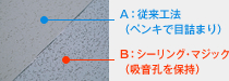●ロックウール吸音板(御社のビルにもきっと使用されています)は、(1)吸音性が高く(2)不燃性・難燃性を有し(3)質感も豊か。たいへん優れた天井材ですが、吸水性が非常に高いために水分を使った洗浄ができません。●そこで従来、やむなく汚れの上からペンキ塗装を行なう工法に頼っていました。●新工法『シーリングマジック』では、ミクロ・パウダーによるコーティング施工を行い、従来工法で犠牲になっていた、(1)(2)(3)すべての特性と機能を保持します。